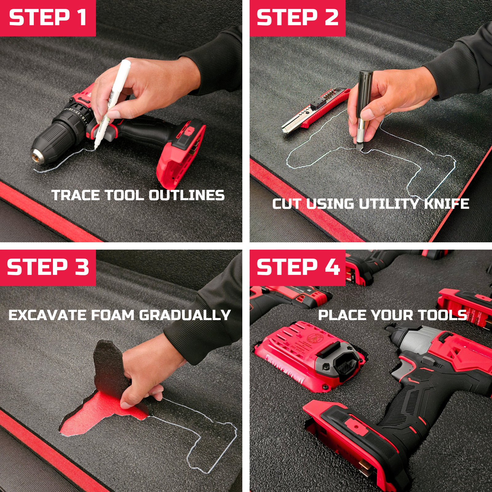 - ADJUSTABLE SIZE & EASY CUSTOMIZATION: Tool foam inserts are easily customizable to match the size and shape of your tools. With a simple outline and cut, you can create designated spots for each tool, ensuring a perfect fit. This not only keeps your tools organized, but also adds a professional and polished look to your toolbox.